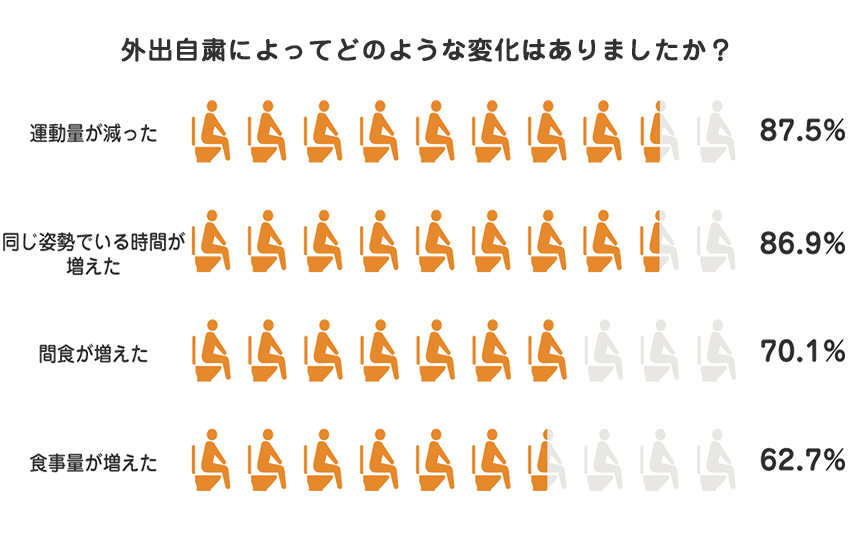 外出自粛によって毎日の生活に変化があったかどうか聞いたところ、「変化があった」と回答したのは71.6%となりました。「運動量が減った」の87.5%が最多となり、ついで「同じ姿勢でいる時間が増えた」が86.9%となりました。
