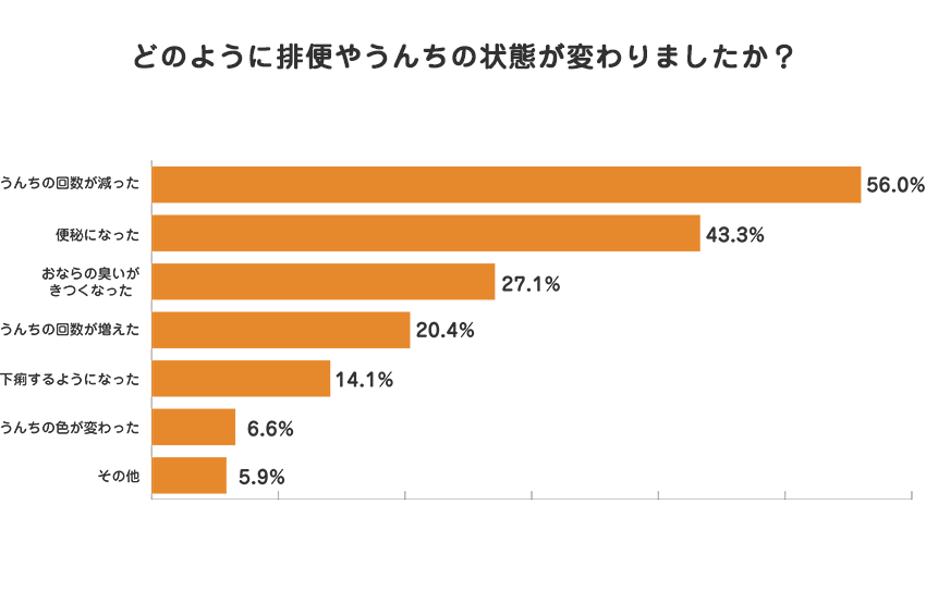 排便やうんちの変化は「回数が減った」が56.0%、「便秘になった」が43.3%。