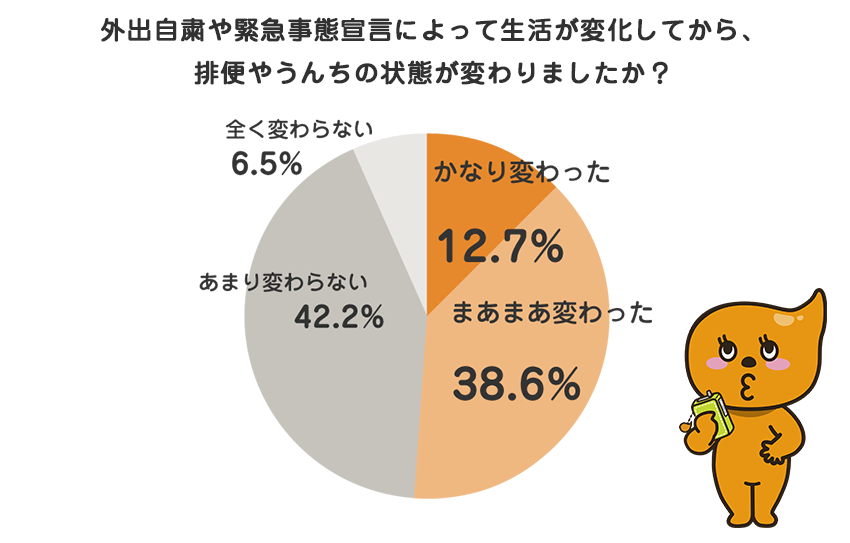 新型コロナウイルスへの不安や、緊急事態宣言・外出自粛によってストレスを感じる人は82.7%。そのうちの51.3%は排便やうんちの状態が変化した。