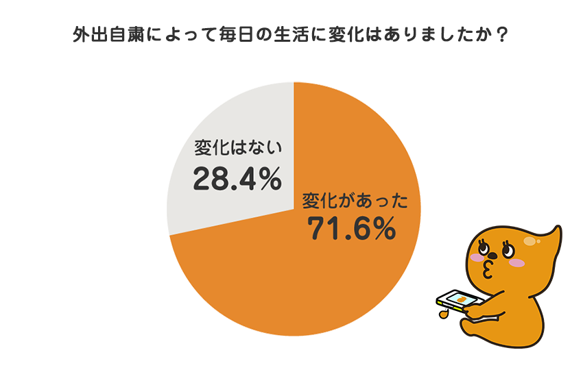 71.6%が外出自粛によって「毎日の生活に変化があった」と回答。最も多いのは、「運動量が減った」の87.5%。