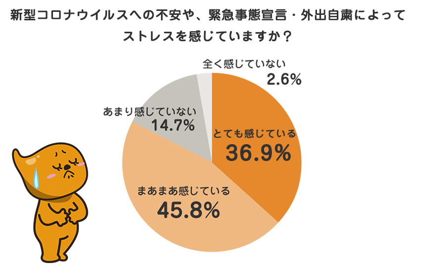 新型コロナウイルスへの不安や、緊急事態宣言・外出自粛によってストレスを感じているかどうか聞いたところ、82.7%が「ストレスを感じている」と回答しました。また、そのうち外出自粛や緊急事態宣言によって生活が変化してから、排便やうんちの状態が「変わった」と回答した人が51.3%となりました。