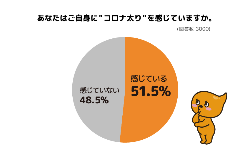 新型コロナウイルス感染防止のための外出自粛などにより”コロナ太り”を感じるかどうか聞いたところ、51.5%が「”コロナ太り”を感じる」と回答しました。また、”コロナ太り”による増加体重は、1〜2キログラムの増加が最も多く、55.1%にのぼりました。
