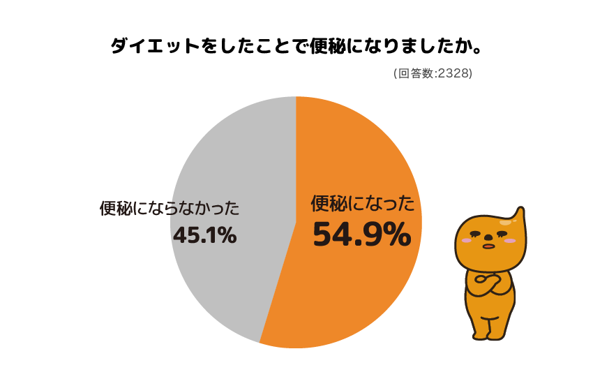 ダイエット経験者に対して、ダイエットによって便秘になったことがあるかどうか聞いたところ、54.9%が「便秘になった」と回答し、半数以上が便秘を経験していることがわかりました。