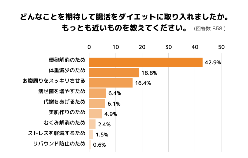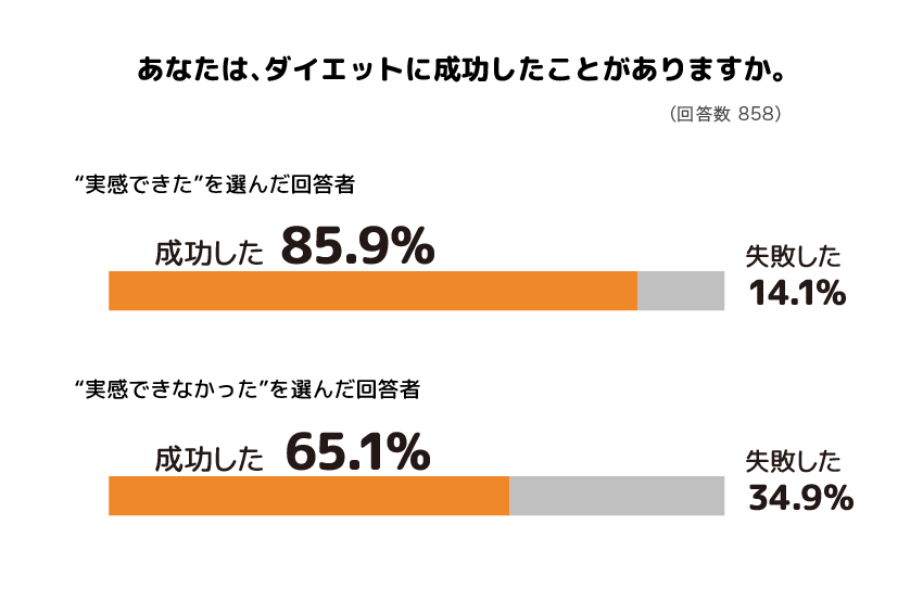 ダイエットに腸活を取り入れていた858名にアンケートを行なったところ、腸活の効果を実感できた人のダイエット成功率が85.9%だったのに対し、腸活の効果を実感できなかった人の成功率は65.1%と、ダイエット成功率に20%以上の差があることがわかりました。