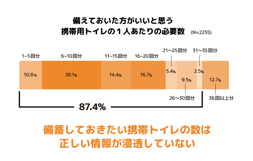 ①備蓄しておくべき携帯トイレの数は35回分以下が87.4%。浸透しない携帯トイレの備蓄数