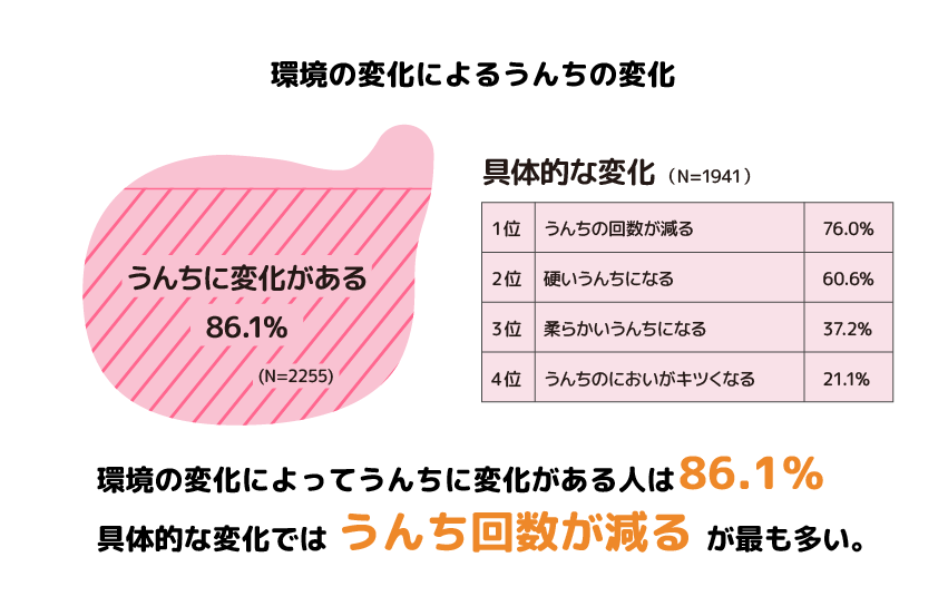 ①環境が変化するとうんちの状態に変化がある人は86.1%。1位は排便回数が減少する。