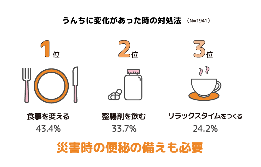 東日本大震災の発生時には、避難所でのトイレの利用しづらさからトイレを我慢したり、水分摂取を控えてしまうことによる「震災便秘」も発生しました。平時の環境の変化でも86.1%の人がうんちに変化があることから考えると、たとえ自宅での避難生活でもうんちに与える影響は大きいと考えます。