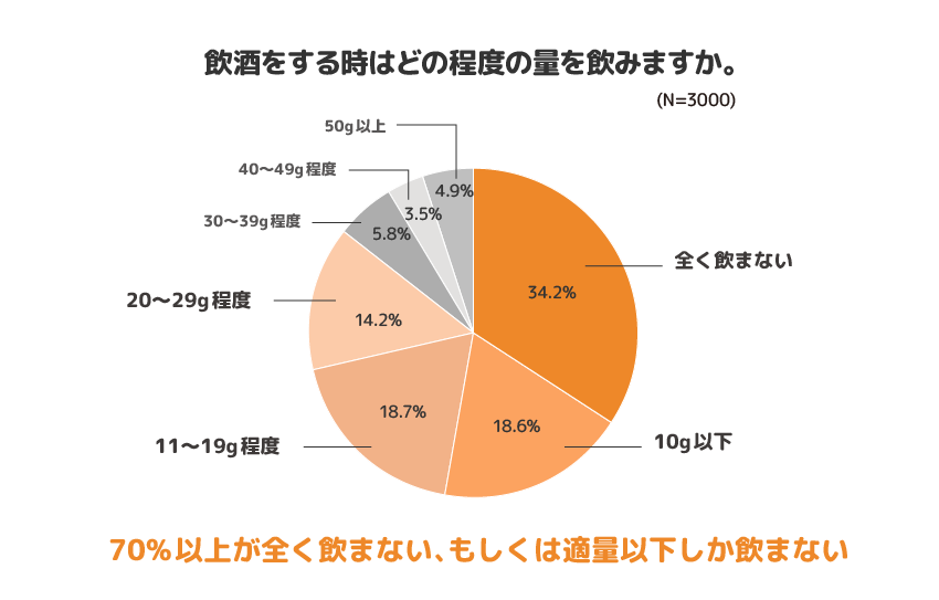 普段の飲酒習慣について34%が「全く飲まない」、37.3%が純アルコール換算で”適量”とされている20gを下回っていると回答しました。