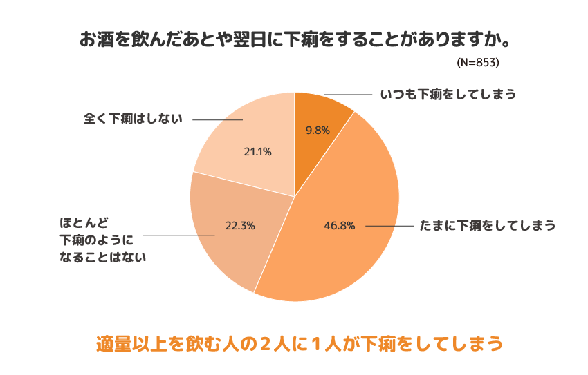 コロナ禍で増えたおうち時間により、晩酌が増えたという方は少なくないのではないでしょうか。ウンログユーザーの皆さんに飲酒の状況についておうかがいしたところ、3割以上の方は「飲酒の習慣がない」と回答し、4割近い方が「適量以下」であることがわかりました。しかし、「適量以上を飲んでいる」という方のうち2人に1人に当たる56.6%となり、「適量以下」の割合よりも約20ptも多くなっています。アルコール摂取量の多い人ほど下痢リスクが高まるということではないかと考えられます。