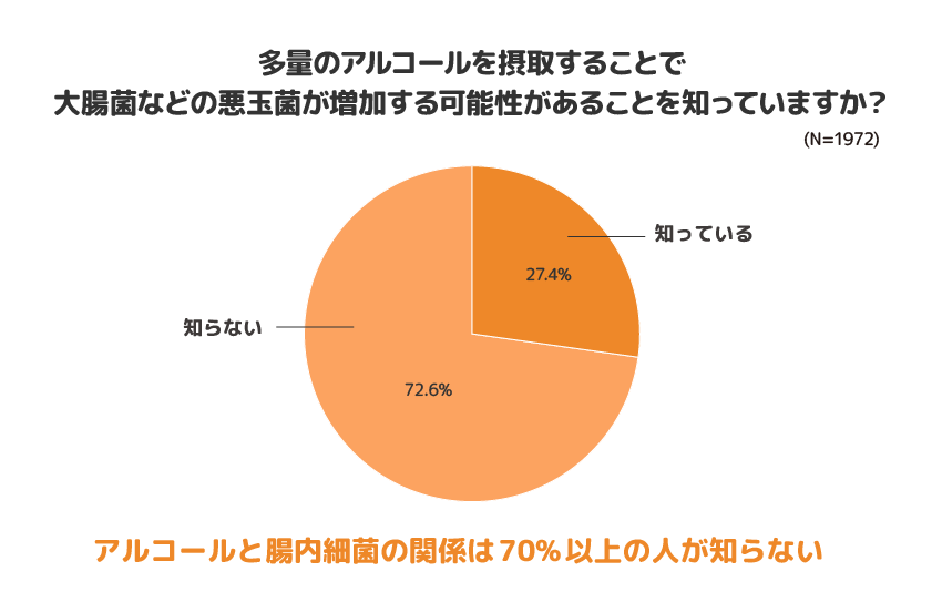 アルコールをとりすぎると腸内環境が悪化するリスクがあることを「知っている」人は27.4%にとどまり、72.6%はリスクを「知らない」と回答しました。