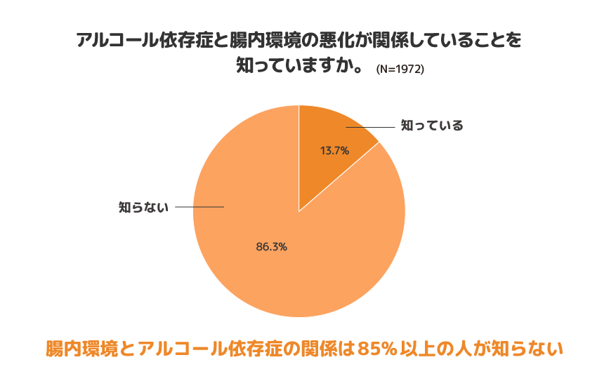 アルコール依存症患者の腸内では、発がん原因物質と考えられているアセトアルデヒドを高濃度に産生する特定の腸内細菌が存在することがわかっています(※3)。アルコール依存症と腸内環境の悪化の関係について知らない人は、86.3%にのぼりました。