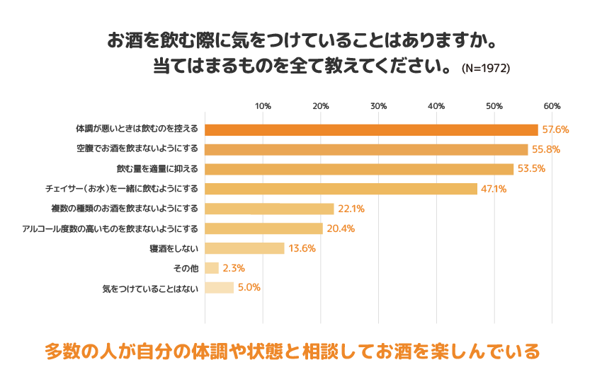 飲酒するときの二日酔いや悪酔い対策として最も多かったのは、「体調が悪いときは飲むのを控える」で57.6%となりました。