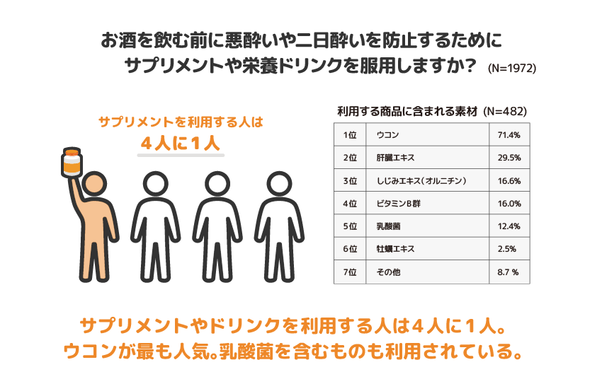 頭痛や嘔吐などをはじめとしたアルコール中毒症状を回避することがわかっている乳酸菌を含むサプリメントでは、利用する人が12.4%にとどまりました。