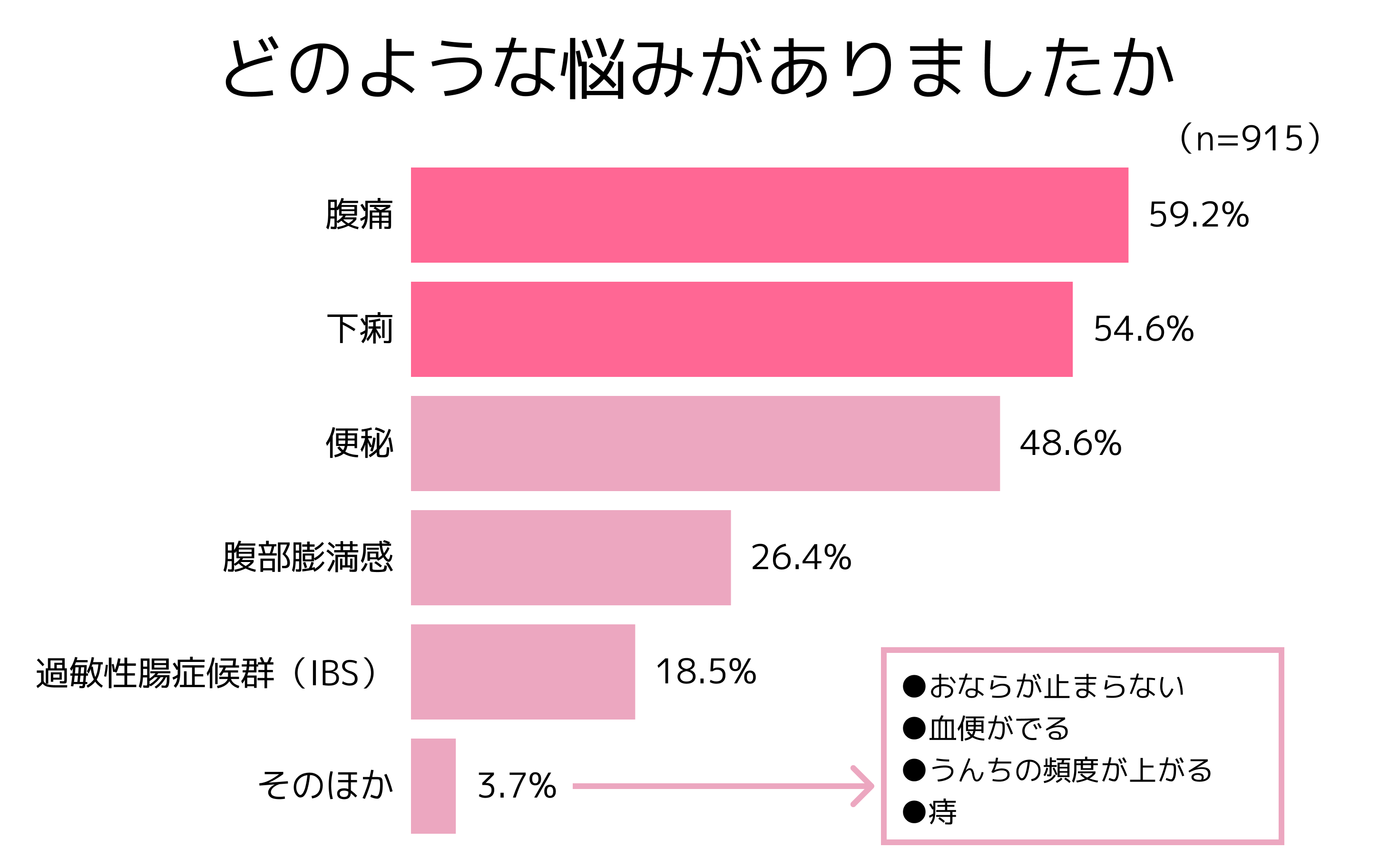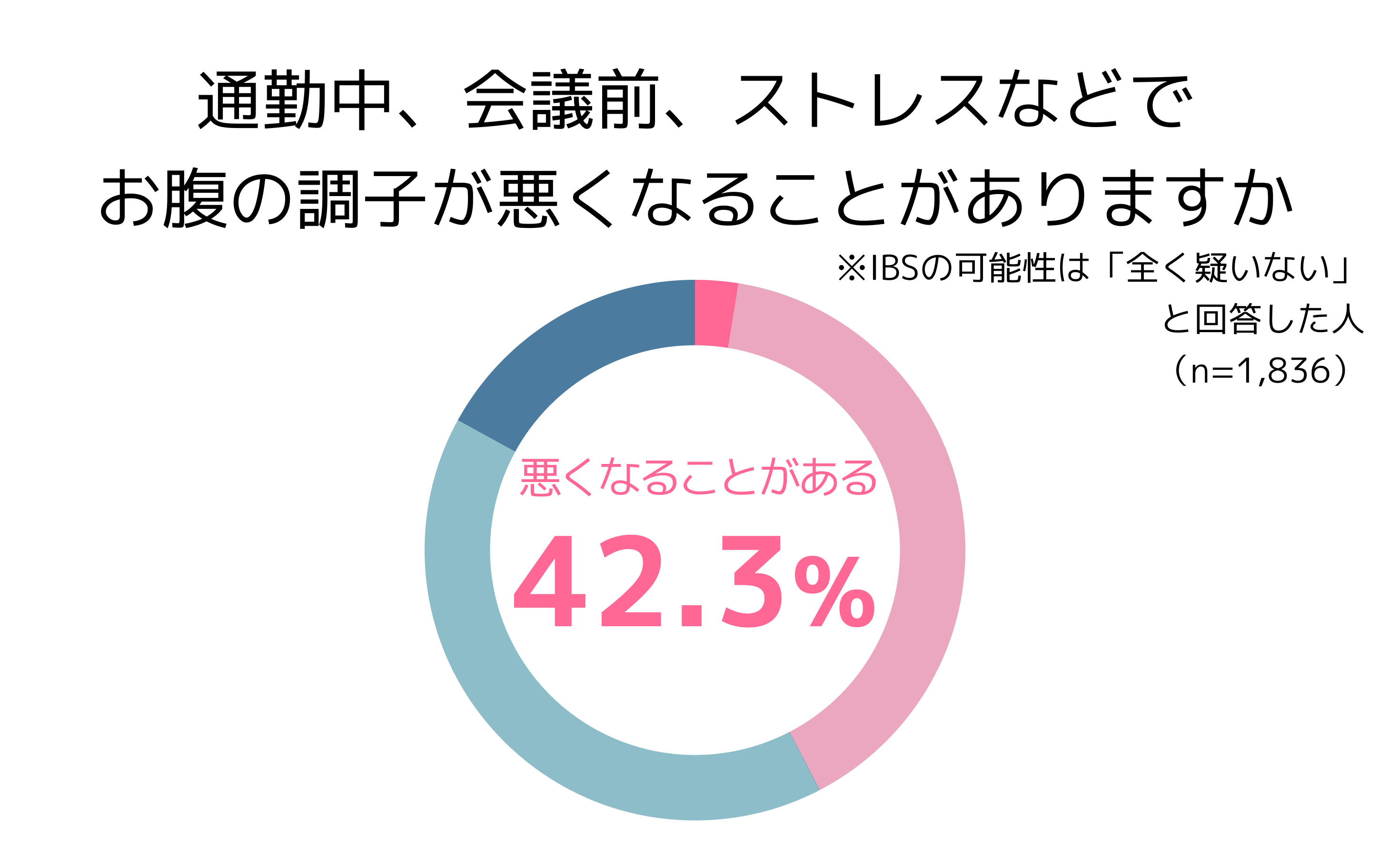 また、「全く疑いはない」と回答した人でも、半数に近い42.3%が通勤中、会議前、ストレスなどで「お腹の調子が悪くなることがある」、と回答。過敏性腸症候群(IBS)を疑うほどではないとしても、お腹の悩みを抱えていることがわかりました。