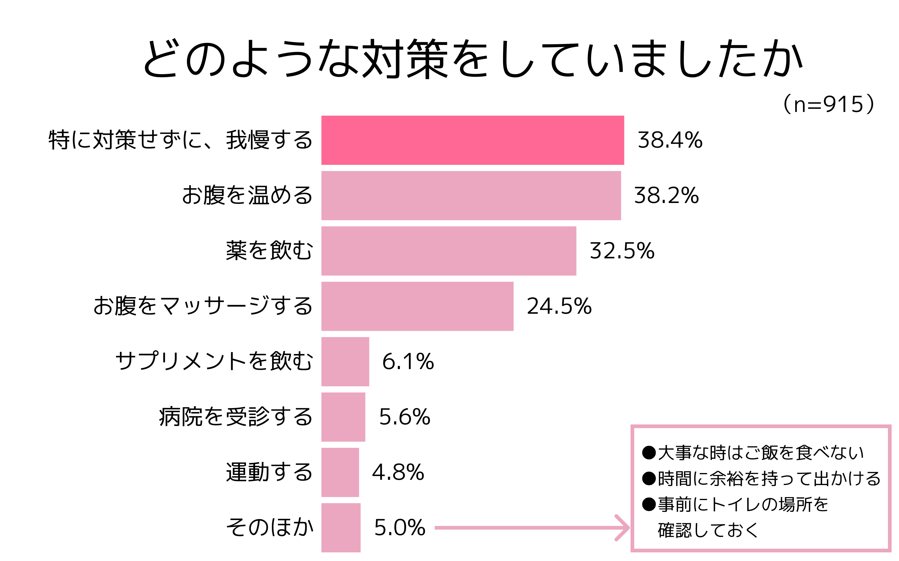 お腹の悩みがあったと回答した人に、どのように対策したかを聞いたところ、「特に対策せずに我慢する」が38.4%と最も多くなりました。