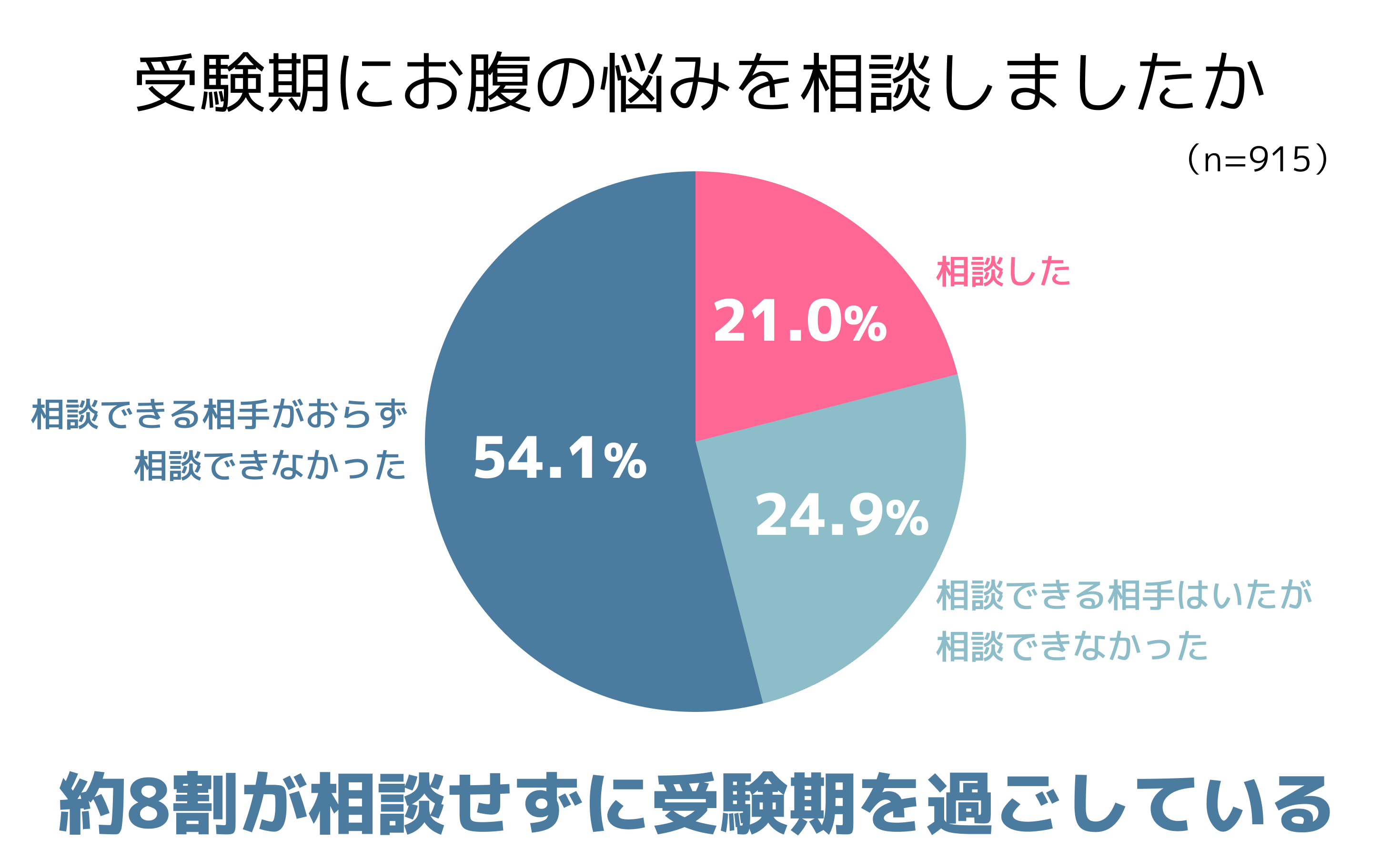 受験期にお腹の悩みについて周囲に相談した人は、21.0%にとどまりました。約8割が相談できなかったと回答しましたが、中でも54.1%にのぼる半数以上は「相談できる場所や相手がいなかった」と回答しました。