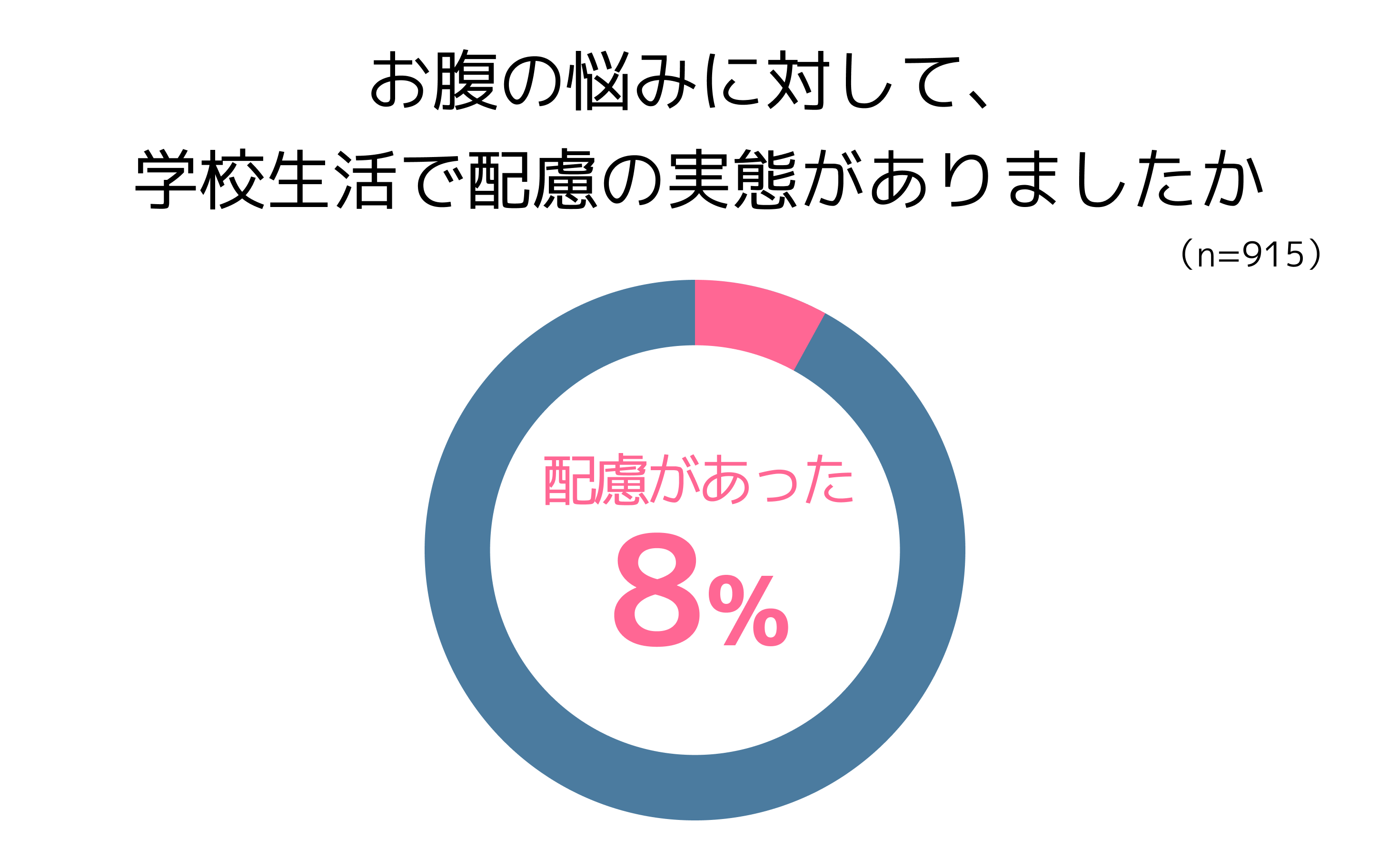 お腹の悩みに対して、学校生活で配慮の実態があったと回答した人は8%にとどまりました。具体的な配慮の内容として最も多かったのは「授業中にトイレに行って良い」で、40%となりました。