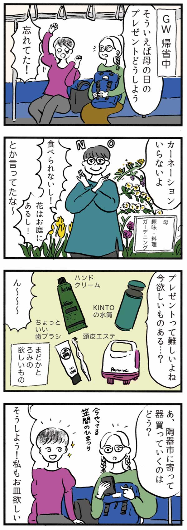 GWに帰省中の二人。電車の中では母の日の話題に。二人がプレゼントに選んだものはーー。