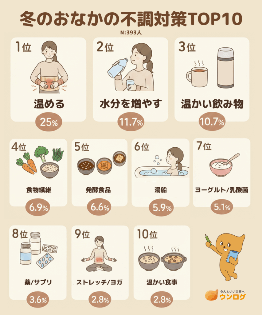 冬のおなかの不調対策として多く挙げられたのは、「温める」「水分を増やす」「温かい飲み物をとる」といった、寒い季節ならではの工夫でした。