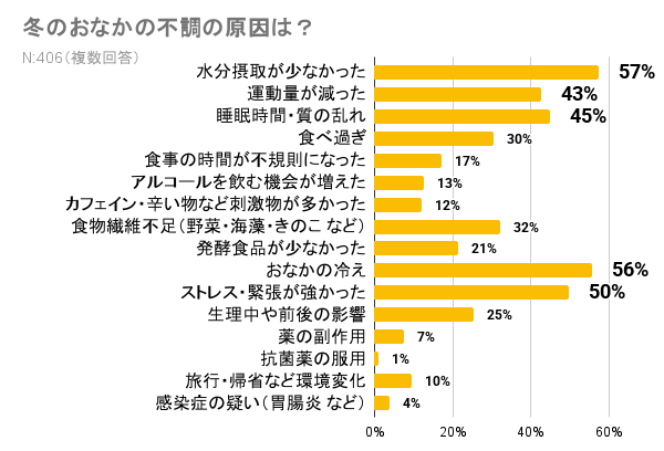 冬のおなかの不調の原因として当てはまるものと回答いただいたのは、「水分不足」が57%、「冷え」が56%と半数以上を占めます。