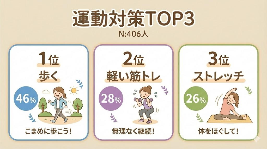 運動での対策は、ハードに頑張るものというよりも、「生活の中でこまめに動く」「冷えでこわばった体をゆるめる」方向が中心でした。