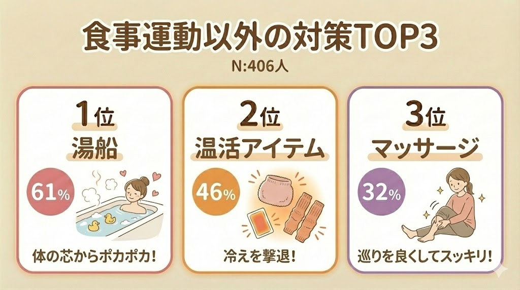 食事・運動以外の対策では、温めるが上位を占める結果に。湯船と温活アイテムが上位に入り、冬の不調は「体を温める」意識で対策している人が多いようです。