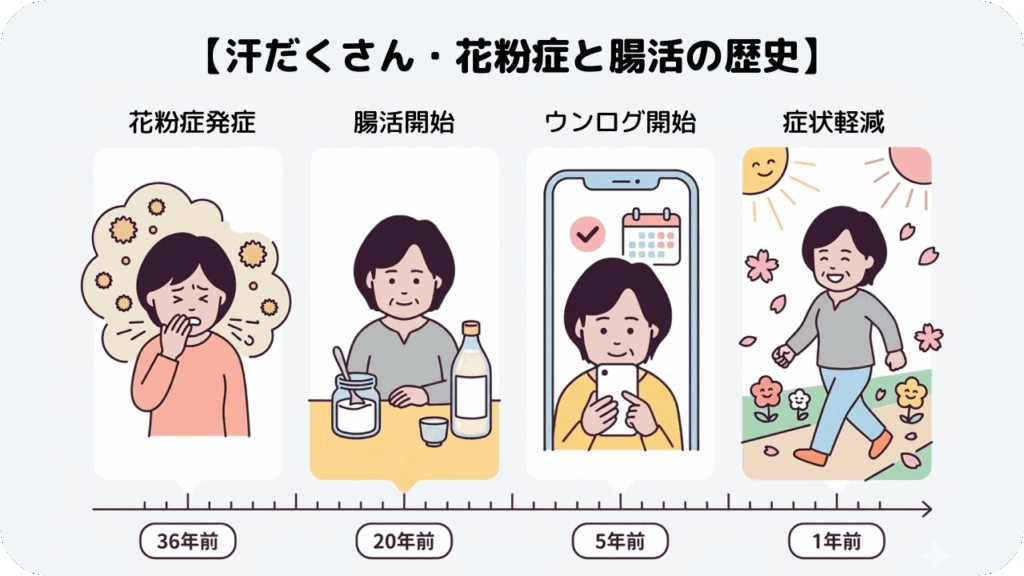 花粉症の症状に悩んでいる人にとって、まさに希望のような体験談をお話してくれましたが、そこには、地道に続けた腸活と観便があったようです。