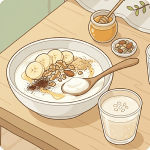 ここ最近ずっと続けている、朝のヨーグルトとアレンジトッピングですね。