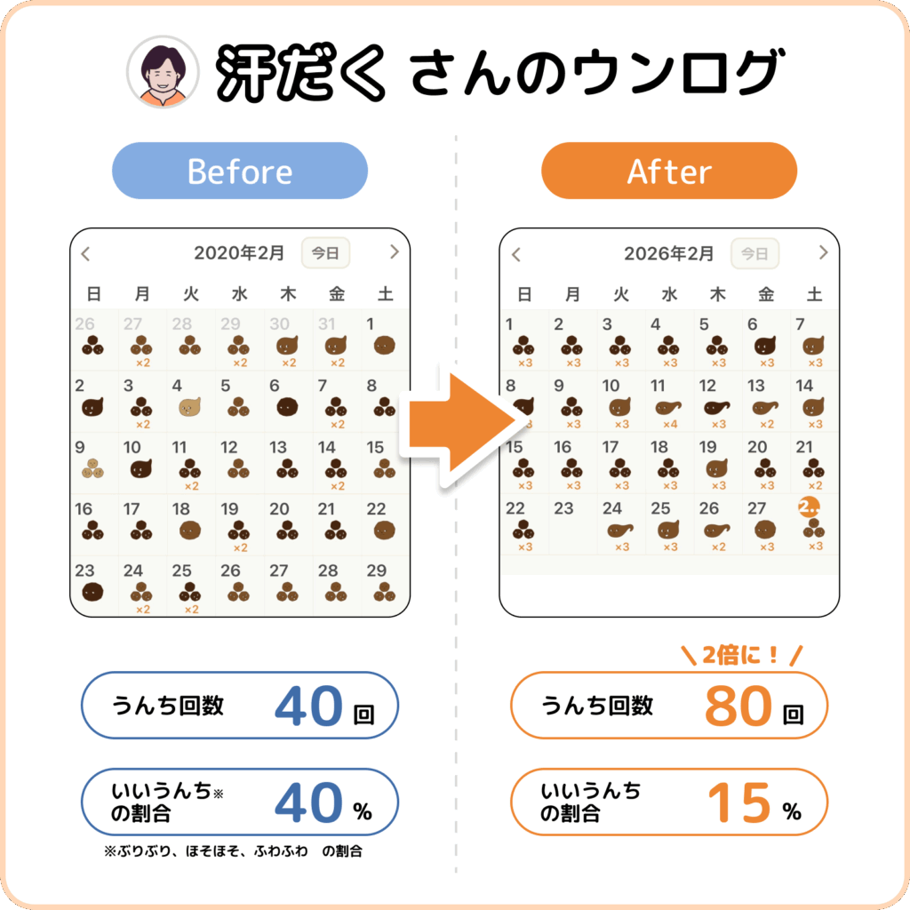 現在は対策を行い、改善傾向にあるという汗だくさん。「不調だった頃(Before)」と「改善した頃(After)」のウンログ画面を見せてもらいました!