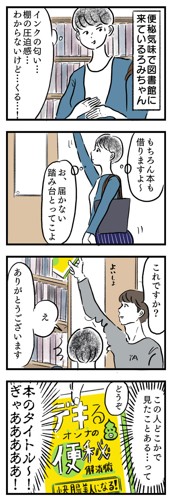 便秘解消のためにいつもの図書館へやってきたろみ。今日は本も借りようと、手を伸ばしているとーー。