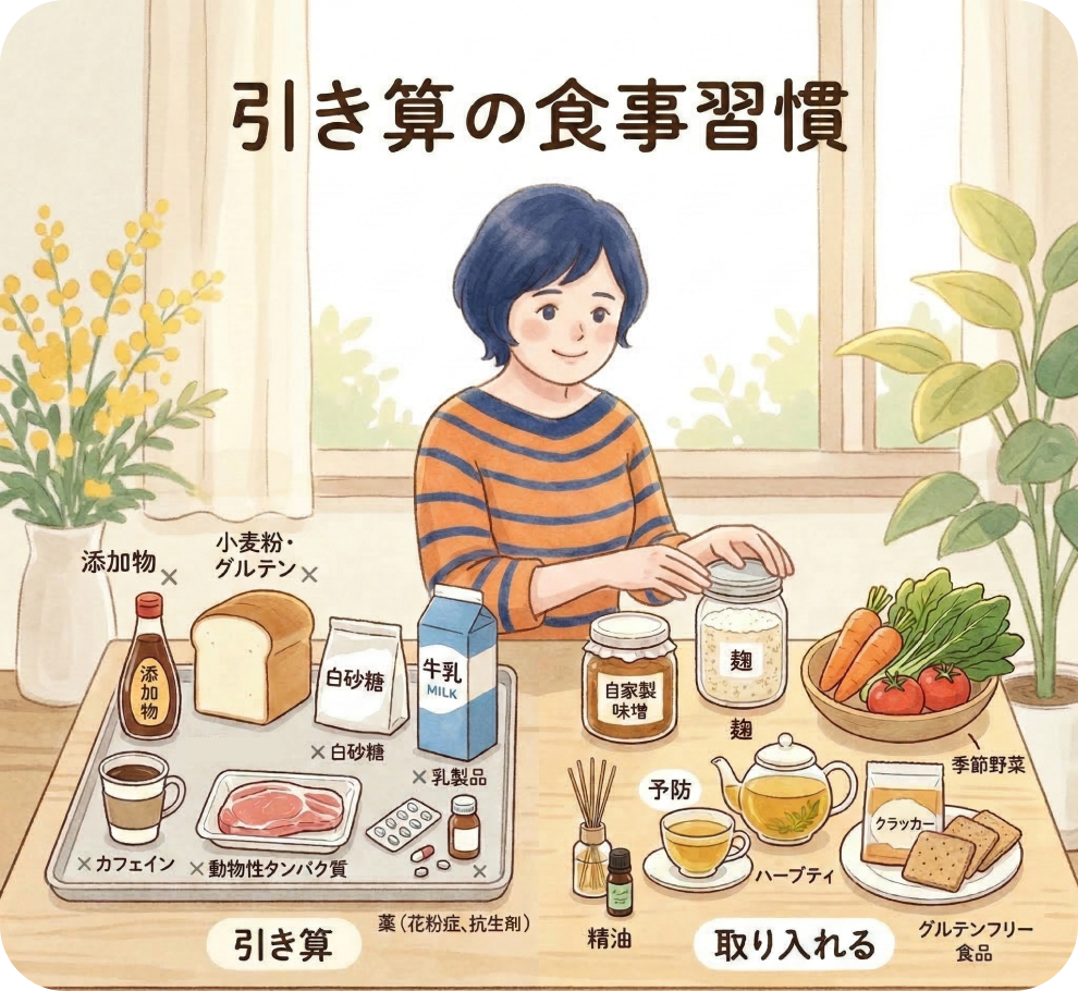 食事では、調味料の成分表示を見て添加物が含まれているものを処分。白砂糖やグルテン、酸化した油、乳製品、カフェイン、動物性タンパク質、農薬をつかったものなどをなるべく控えるようにしました。薬も基本的に断つ※(花粉症の薬、抗生剤、アスピリン系の薬など)ように。