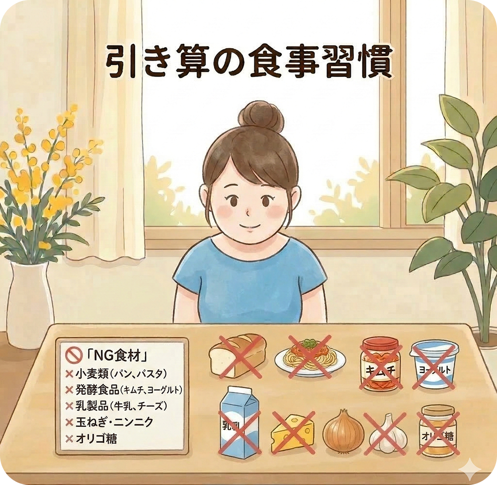 一年中行っているのは、おなかが張りやすいものを抜いた生活です。 特には小麦類、発酵食品、乳製品や玉ねぎ類、ニンニクなどです。