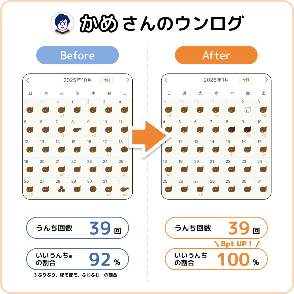 まずはかめさんに「不調だった頃(Before)」と「改善した頃(After)」のウンログ画面を見せてもらいました!