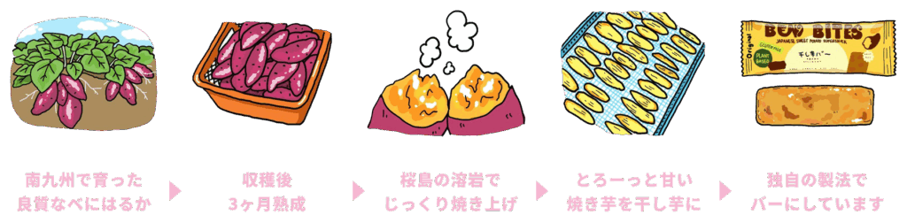 はい。紅はるかを90日以上熟成させたあと、桜島の溶岩を使用し、遠赤外線でじっくり焼き、そのあと独自の製法でバーにしています。
