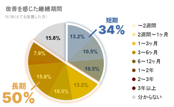 3ヶ月以内の短期間で効果を感じた方は34%。一方で、3ヶ月以上の中長期で効果を感じた方は、50%いることがわかりました