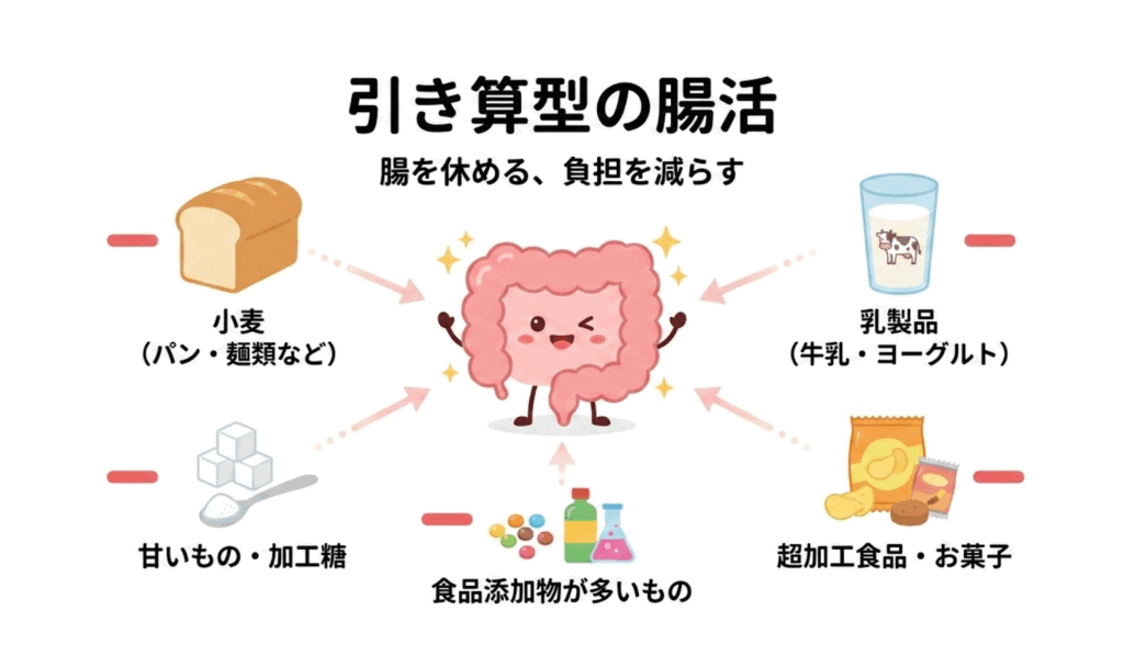 「引き算型」は、腸内環境に悪い影響があるものをとらない対策をしている方です。