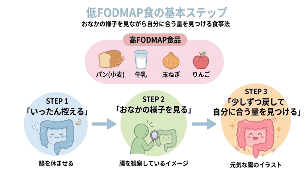 低FODMAPは、すべてをずっと避ける方法ではなく、いったん控えてから少しずつ戻し、自分に合う量や食材を見つけていく考え方。目的は「制限すること」ではなく、自分のおなかの傾向を知ることにあります。
