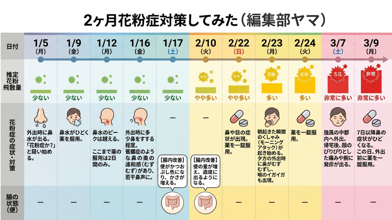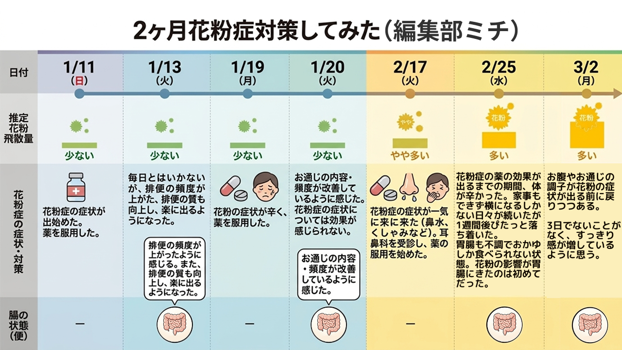 花粉症の症状はどう変わるのか。腸や便には変化があるのか。リアルな体験をレポートします。