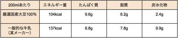 マルサンアイの「厳選国産豆乳100%」は、牛乳と比べてカロリー・脂質・炭水化物は低く、たんぱく質は高くなっています。